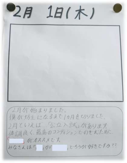 2月です。今日は1・2年生の学習診断テストが行われるため、3年生は「恩返しの日」として、後輩たちがテストに集中できるように、休み時間の過ごし方も心配りをしていました。その気持ち、行動があったかいですね。