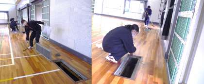明日の愛校活動に先駆けて、今日は3年2組が体育館の大清掃を行っていました。