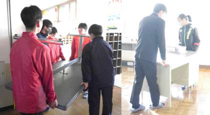 重い棚や教師用机や作業机なども、仲間と力を合わせて、どんどん教室へ運び入れていきます。チームワークのよさで、なんと10分ほどで2教室分の片付けを終えることができました。