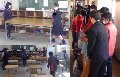 昨日、3年生の男子生徒が特別支援学級の机や棚等の教室への運び入れを進んで手伝ってくれたことを紹介しました。今朝は、さらにその人数が増え、登校してきた3年生が次々に手伝う姿が見られました。