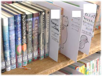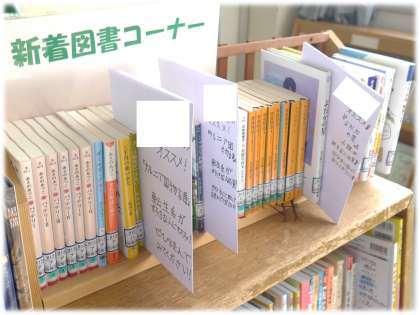 各学年フロアにも掲示されている「図書委員のすすめるこの1冊」図書室には、さらにおすすめした本がどれかが分かるように工夫した紹介がされています。
