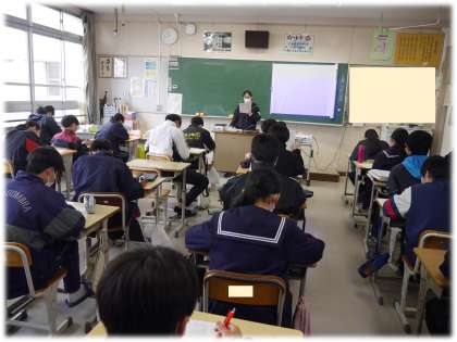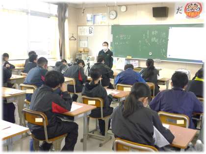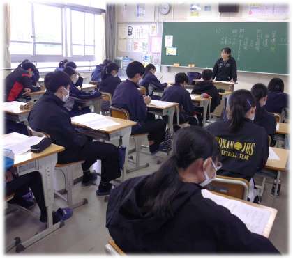 2年生の教室では、各教科のテスト返しが行われていました。教科担任の解説を聞きながら、自分の理解が不十分だった部分を再確認する2年生です。