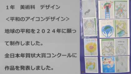 デザインを工夫したアイコン制作や様々な技法を取り入れながら抽象的な作品制作に取り組んできました。自分の作品づくりに一生懸命に取り組んでいることが伝わってくる力作ばかりです。1年生のみなさんは、移動教室等の折などに、ぜひ学年の仲間の作品を鑑賞してみてください。