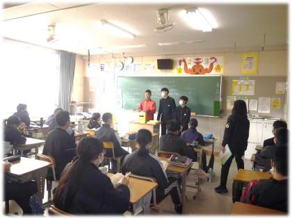 登校時の昇降口での呼びかけ、朝の読書タイムでの各教室めぐり。それぞれに、生徒会執行部から熱いメッセージが届けられています。全校のみんなにこの活動について自分事として関心をもってもらおうと、生徒会長の秘策も用意されていました。