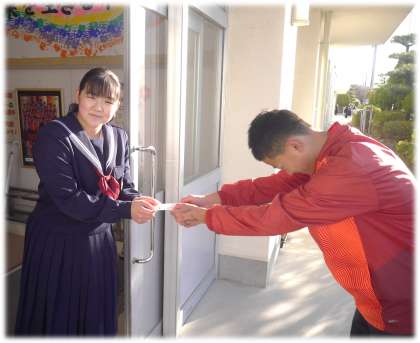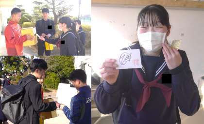 なお、募金に協力した生徒へは、生徒会長の貴重なお手製の〇〇が贈呈されていました。大変貴重な1枚です。渡す側も渡される側も思えずにっこりする一場面でした。