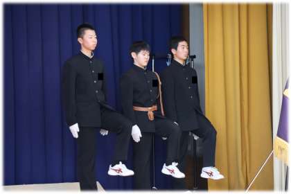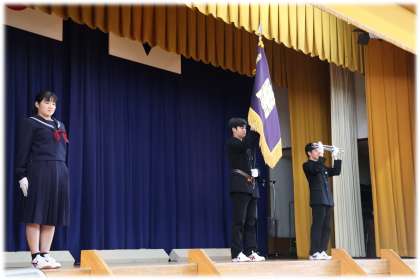 儀式的行事で学校の顔として、校旗を掲げ、校歌を伴奏する旗手とピアニストがいよいよ3年生から2年生へと引き継がれました。旗手やピアニストは4人ですが、学校を支え、守り、引っ張り、新たな風を吹かす学年としての気概は、3年生全員から2年生全員へと引き継がれる、そんな時間となりました。