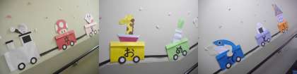 こちらは、天井飾りに、今年度初めて登場した階段壁面飾り。各学級の級訓をイメージし、先頭は学年主任です!
