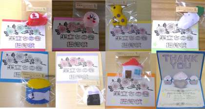 また、教室の3年生の机には、今日の巣立ちの会の招待状とともに、学級を表す手作りマスコットが贈られました。