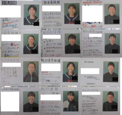 「おはようございます。令和6年度生徒会〇〇に立候補した〇〇です。よろしくお願いします。」昇降口前の校庭では、朝から生徒会役員候補者のさわやなかあいさつ等が響き渡っています。昇降口には選挙ポスターも貼られ、読書タイムやお昼の放送を利用した選挙活動も活発に行われています。