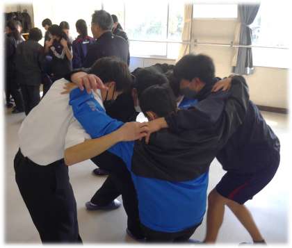 床磨きの前に、円陣を組んで、互いの士気を高める姿。