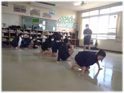 和気あいあいと清掃を進めながら、教室の床がみるみると磨かれていきます。