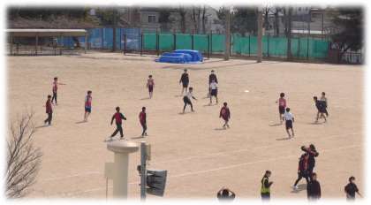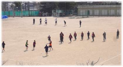 運動場では、1年生が元気いっぱいに体を動かしていました。狙ったところにディスクがとぶように、手首のスナップを使いながら思いっきり投げています。互いに声をかけ合いながら、楽しそうにチーム戦に取り組んでいました。