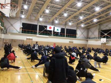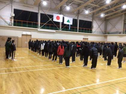 朝6時半起床、7時には体育館に集合して、朝のつどいを行いました。