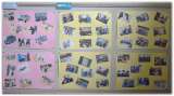 第2美術室に向かう廊下に、3年生の中学校生活の思い出を表現した作品が展示されて...