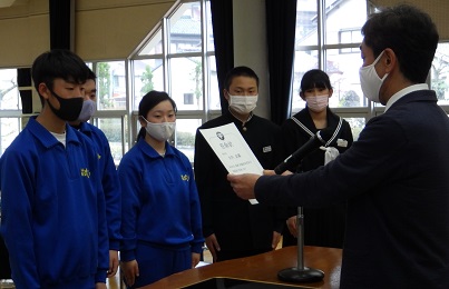 生徒会役員と委員長、学年級長の任命式を行いました。前期は体育祭も行います。全校生徒で稲武中学校を盛り上げていきましょう。