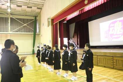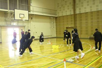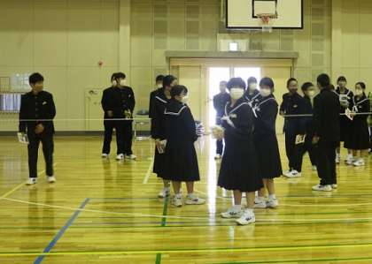 歓迎会では、全校生徒を縦割り班に分けて3種類の出し物をやりました。「クイズ魂」では、稲武中学校に関する問題を◯か×かで考えました。「古今東西魂」では、お題に合うものをリズムに合わせてグループ毎に順番に答えました。最後に「ボールゲーム魂」では、決められた場所から投げたボールがかごに何個入ったを競いました。1年生から「楽しかった」「胸がわくわくした」等の感想があがりました。