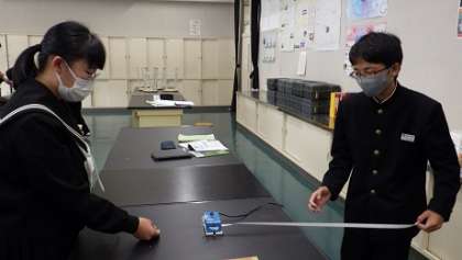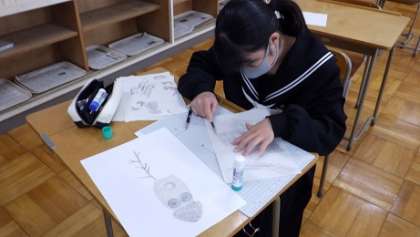1年生は、美術科で凹凸のあるものの上に紙を置いて鉛筆でこすって描いたものを、切って台紙に貼り付けて想像上の生物を作成しています。2年生は、技術科でエネルギーを動力に変換する技術を調べ発表しました。3年生は、理科で記録タイマーを使い、テープを引いた運動(移動した距離)を記録しました。