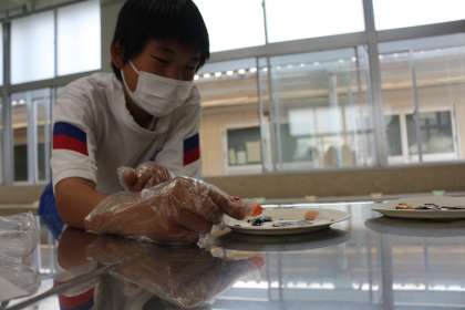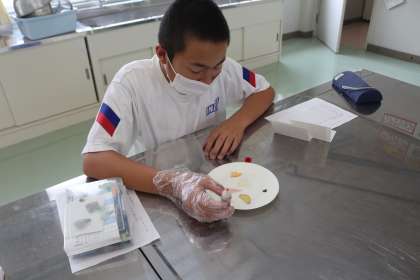 2年生は、家庭科で食物に含まれるデンプンを調べました。様々な食物にヨウ素液を加え、色の変化からどんな食物にデンプンが含まれているかを調べました。