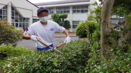 2年生が今日から3日間職場体験で学んでいます。1日目の様子をお知らせします。写真は、上から、たけうち牧場で、牛に餌を与えています。ちゃーりー'Sガーデンで、苗の手入れをしています。学校で、植木の刈り込みをしています。