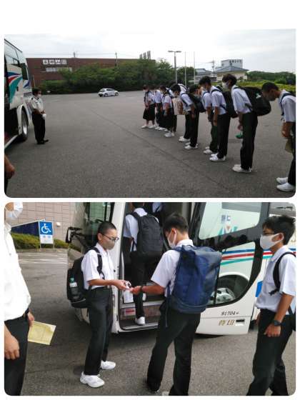 バスの運転手さんにあいさつをし、コロナ対策の消毒をしてバスに乗り込みます。