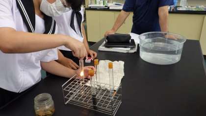 1年生は理科で、酸素を発生させて集め、性質を調べました。手順を覚えて、目に見えない気体を試験管4本に集めました。そして、酸素は火のついた線香を激しく燃やす性質があることなど、実験を通して理解を深めました。