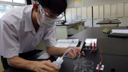 3年生は理科で、水溶液に電流が流れるか調べました。6種類の水溶液を用意し、順番に電圧を加えて調べました。電流が流れる水溶液と流れない水溶液があることがわかったので、溶けている溶質の性質をこれからの授業で調べていきます。