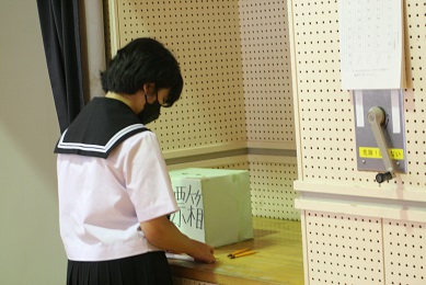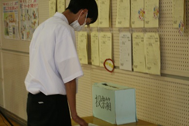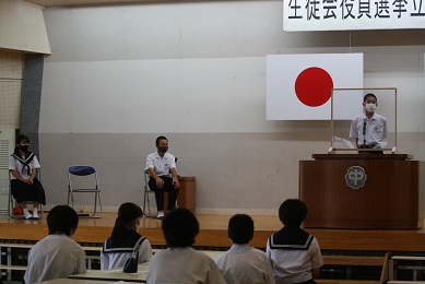 今日は後期生徒会役員選挙を行いました。初めに立候補者3名が、どんな学校にしたいか自分の思いを語り、他の生徒は真剣に話を聴きました。その後、全校生徒による投票を行いました。明日は、前期最終日です。