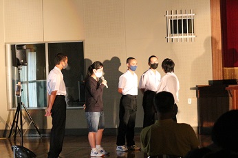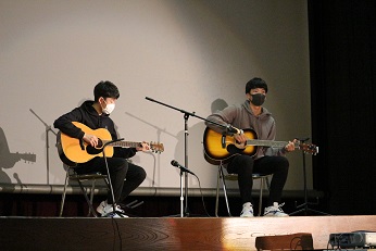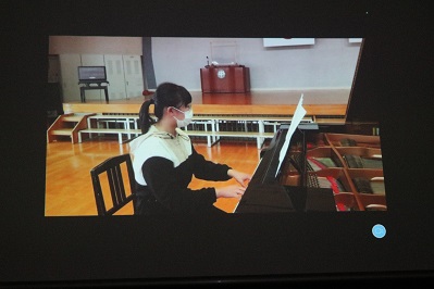 4番目は昨年度の三送会で結成した「面白四天王」が、昨年度と新作の面白動画を流しました。5番目「ビッグ・ストーン」は、純恋歌を2人でギター演奏しました。6番目「十七条の憲法」は、多目室からのリモート出演でピアノ演奏をしました。