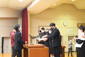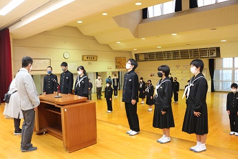 今朝は任命式を行いました。各学年級長、各委員会委員長に校長先生から任命状を頂きました。次に、赤い羽根共同募金のポスターコンクールに入選した2名に賞状が授与されました。最後に、先日行った生徒会主催レクバレー大会で活躍した3チームとMVP1名に症状が授与されました。