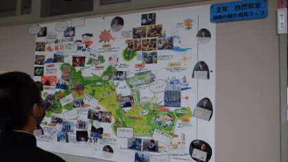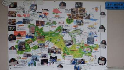 2年生が篠島で学んできたことを「篠島の魅力発見マップ」にまとめました。生徒に聞いたところ、「篠島は自然豊かで、海がきれいで、人はとても優しい」とうれしそうに話してくれました。