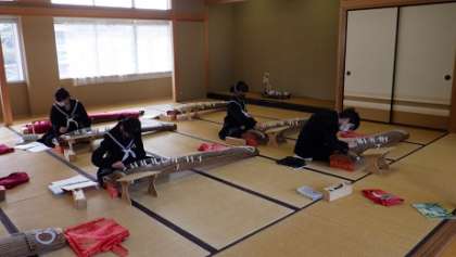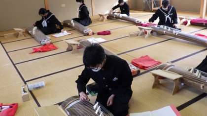 1年生は音楽で琴を演奏しています。「さくらさくら」を弾けるようになり、今は「さくらさくら」の曲に合うような前奏曲を創作しています。弦をしっかりはじいて練習しています。
