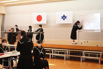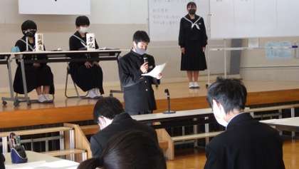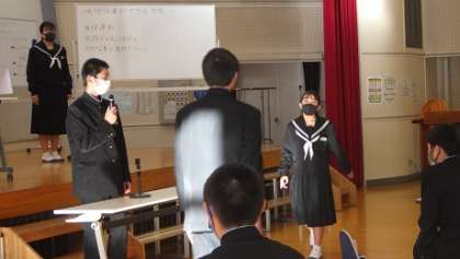 後期生徒総会を行いました。はじめに、各委員会委員長が後期活動計画の説明と質問意見に対する答弁を述べました。次に、生徒会三役がそれぞれの公約について説明し、全校で話し合いを行いました。
