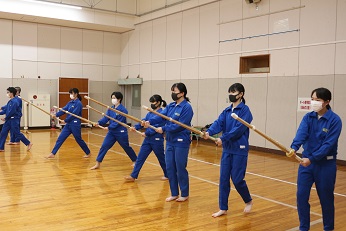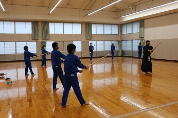 1年生と2年生は体育で足助警察署の方から剣道を教わりました。竹刀よりも重い模造刀や木の棒を振って練習し、特に足さばきと竹刀の振り方を学びました。
