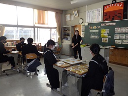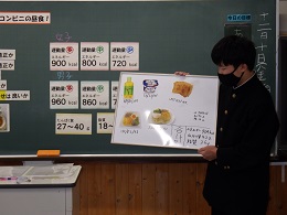 毎日の献立を考えている栄養教諭の大見先生から食育について学び、実際にコンビニエンスストアで売られている商品の栄養表示を見ながら、バランスのとれた理想のお昼ご飯を考えました。