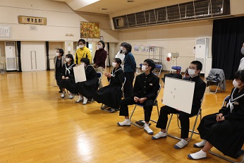 1年生は新年会を行いました。全員が何らしかの出し物を考え工夫して発表しました。画像は、曲に合わせて早口言葉を言う。個人やチームで考えて解くクイズとなぞなぞの様子です。