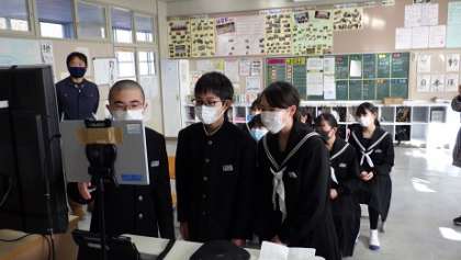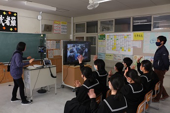 1年生が、パソコンを利用して小学6年生に学校紹介を行いました。生活、勉強、部活のことについて説明したり、「夏休みに宿題はどのくらい出ますか」という質問に答えたりして、画面越しに楽しく交流できました。