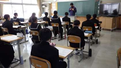 中学生になり、二日目。学級の時間に「生活の心得」を確認しました。17名、真剣な表情で担任の先生の話を聴く姿が印象的でした。