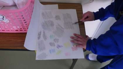 1年美術では「フロッタージュ」を学んでいます。校内を歩き回り、好みの場所で凹凸をこすって模様を写し取りました。