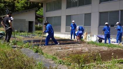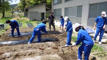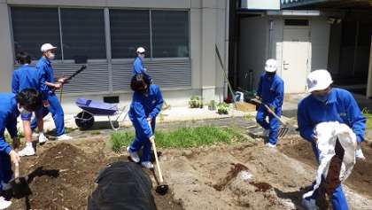 3年技術では野菜の苗植えをしました。サツマイモ、ジャガイモ、パプリカ、オクラ、トマト、キュウリなどなど、自分の担当する野菜を決めて植えました。「早く食べた〜い!」と気の早い生徒の声も聞こえてきました。