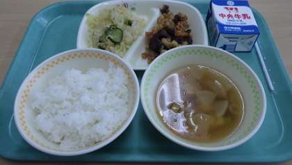 本日のメニューは「ごはん、レバーと大豆の甘辛煮、たくあんあえ、かみなり汁、牛乳」計823kcalでした。とても美味しかったです。ごちそうさまでした。