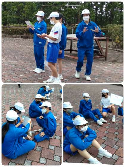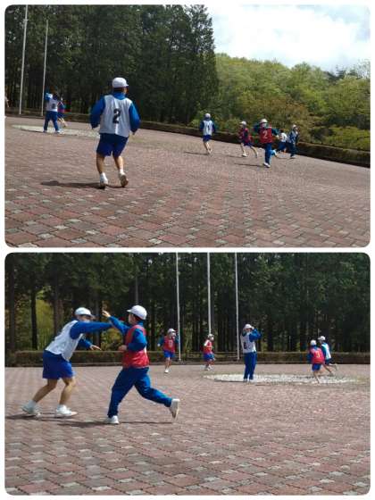 オリエンテーション合宿最後の活動は、各班で企画したレクリエーションです。ハンカチ落とし、クイズ、帽子取り、ドッチボールでした。久しぶりの外遊びに大興奮でした。