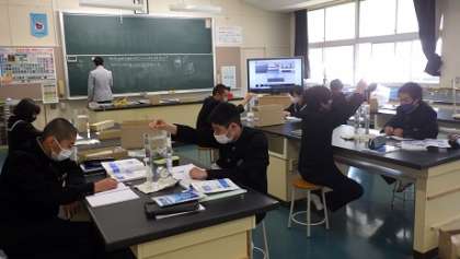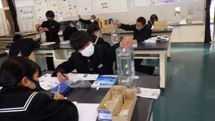3年理科の本時の学習課題は「物体に加わる水圧の大きさはどのようになっているか」でした。実験を行い、考察しました。