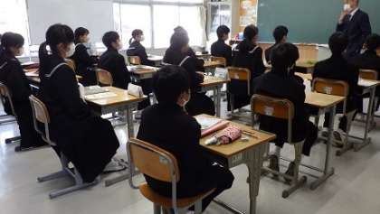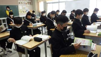 本時は、来月に予定されている初めての中間テストについてどのように評価されるのか、どんな問題が出るのか、丁寧な説明を受けました。人の話を聞く姿勢がとてもいい1年生です。