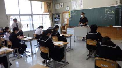 本時の学習課題は「連立方程式の加減法解こう」でした。配られたプリント類を整理してノートに貼ることもとても大切です。