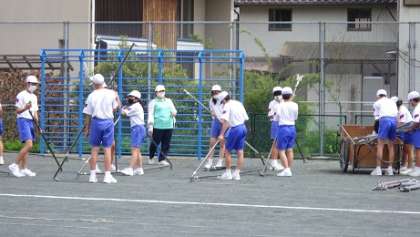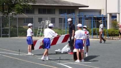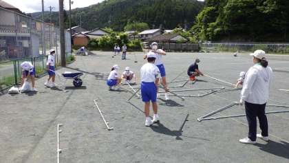 午後からは明日の体育祭に向けて準備を行いました。グランド整備、テント張、本部や来賓・保護者席の設置、遊具の封鎖など、全員で協力して行いました。