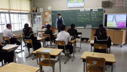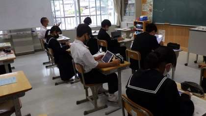本時は「日本と海外の俳句の違い」について学習を進めました。全体練習の後、タブレットを活用して新出語句、本文の個別練習を行っています。