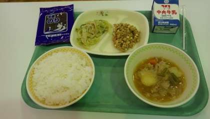 本日の献立は「ごはん、手巻きのり、チーズ納豆、ごま酢あえ、肉じゃが、牛乳」計828kcalでした。今日もとっても美味しかったです。ごちそうさまでした。