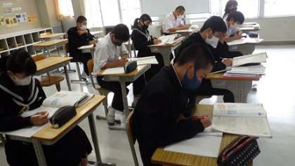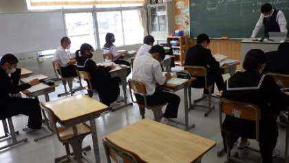 本時は英語で「俳句」を作りました。Topicとkey wordがポイントです。3年生が選んだtopic はtest,animals,summer でした。