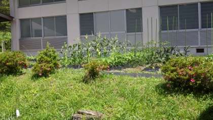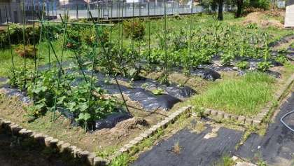 武道場前に学校畑があります。3年生が自分の担当する野菜を決め、世話をすることになっています。キュウリ、ピーマン、えだ豆、トマト、ナス、ジャガイモ、トウモロコシ、レタス、サツマイモ。早く大きくならないかなぁ〜。