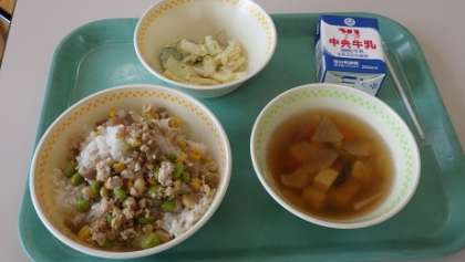 給 食 公開日 2022/06/10 更新日 2022/06/10 お知らせ 本日の献立は「かみかみそぼろ丼、マカロニサラダ、八杯汁、牛乳」計819kcalでした。今日もとっても美味しかったです。ごちそうさまでした。